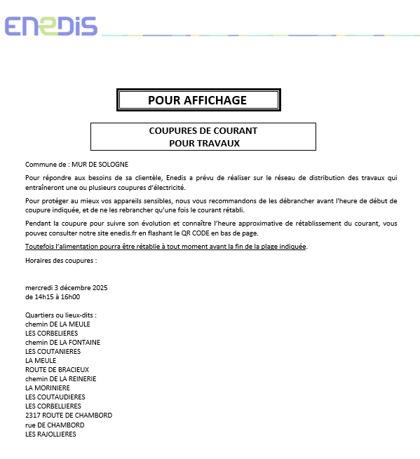COUPURE ELECTRICITE : Mercredi 3 décembre 2025