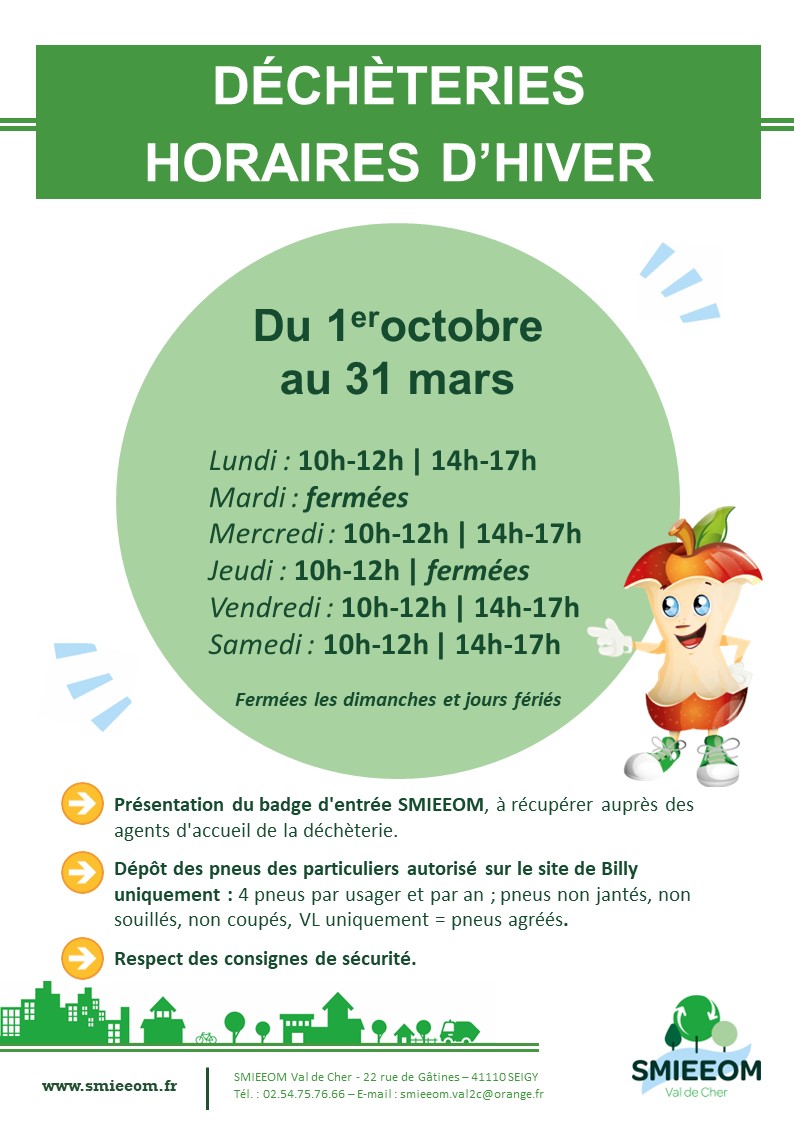 A compter du mercredi 1er octobre, les 4 déchèteries du SMIEEOM Val de Cher : Billy, Le Controis-en-Sologne, Montrichard Val de Cher et Noyers-sur-Cher, passent aux horaires d’hiver :